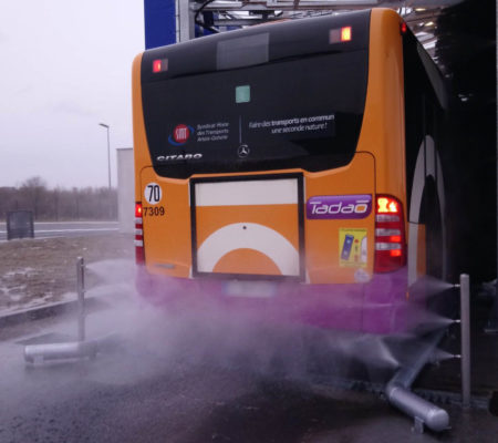 Die Installation eines mobilen Waschportals, das es ermöglicht, Busse unter Vermeidung von Rückspiegeln zu waschen, um Schäden zu vermeiden, mit einer Waschzykluszeit von 3 m bis 3 min 30, je nach Länge des Busses. Das Portal ist mit 2 vertikalen Bürsten und 1 horizontalen Bürste zum Waschen des Daches von Fahrzeugen ausgestattet.